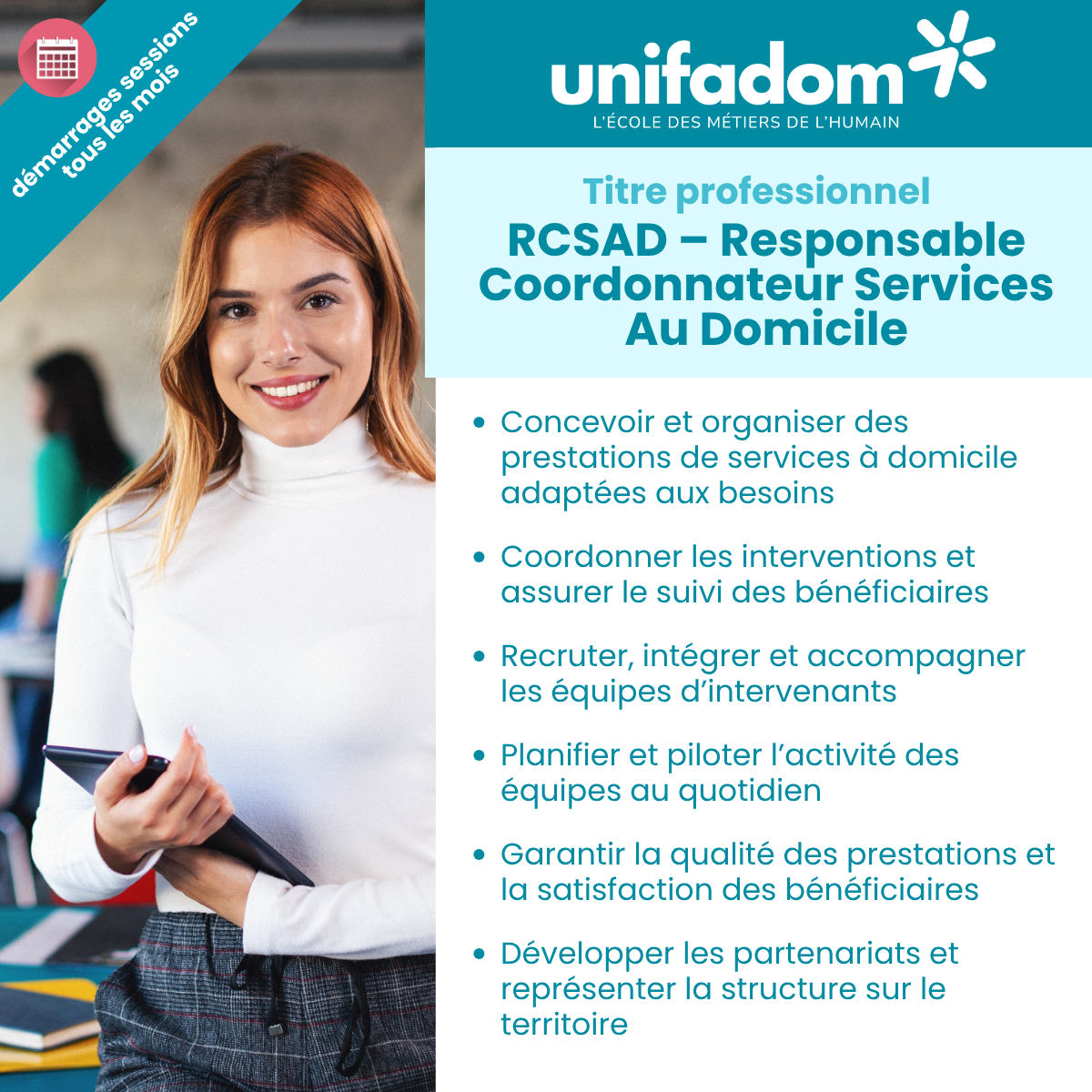 Avec le Titre Professionnel Responsable Coordonnateur Services au Domicile proposé par Unifadom, vous vous formez à un métier complet et concret :